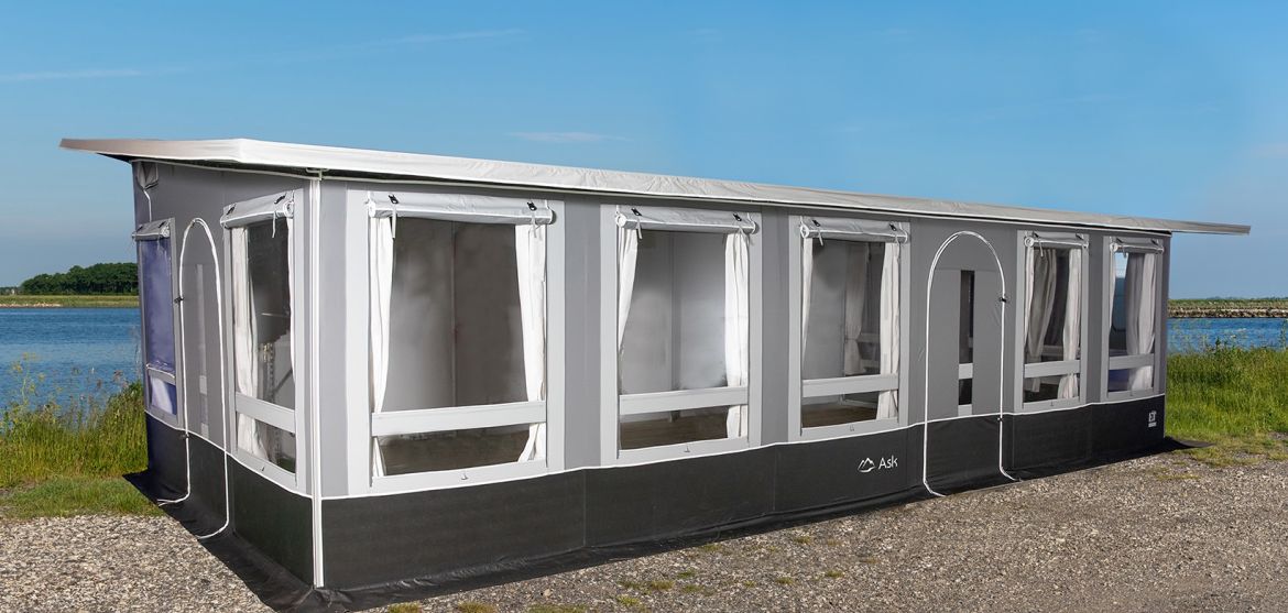"Koniec z montażem i demontażem przedsionka. Jeśli chcesz zabrać przyczepę na wakacje, to też nie ma problemu. Namiot całoroczny Ask stoi równie pewnie w większości warunków północnych, dzięki swojej niezwykle stabilnej i bezpiecznej konstrukcji, zaprojektowanej do samodzielnego montażu. Namiot dostępny jest w czterech modelach, z których trzy mają głębokość 3 metrów i szerokość 4,54 metra, 5,70 metra i 6,87 metra, a największy model ma głębokość 3,5 metra i szerokość 7,27 metra.